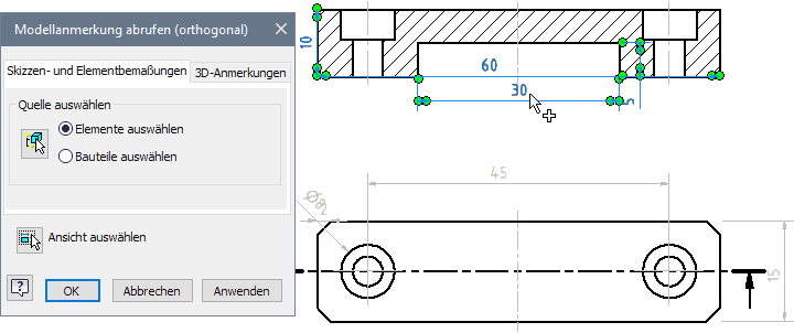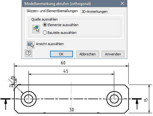 Im Beispiel ist es uns gelungen, fast alle Maße in Form von Modellbemaßung abzurufen. Nur die Bemaßung der beiden Bohrungen ist noch unvollständig:
