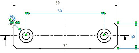 - Bisher ist dies z.B. in der Schnittansicht für die Bauteil-Länge 60 noch nicht gewährleistet. Die betroffenen Maßhilfslinien müssen noch mit dem Cursor korrigiert werden (Bemaßung auswählen und mit Cursor an der Markierung der Maßhilfslinie bis zur Körperkante ziehen):