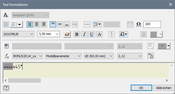 - Hinweis: Der Text 45° passt sich nicht an eine Änderung des Fasenwinkels im Modell an! Solch einen Trick darf man nur anwenden, wenn man genau weiß, dass sich der Fasenwinkel für dieses Bauteil nie ändert!