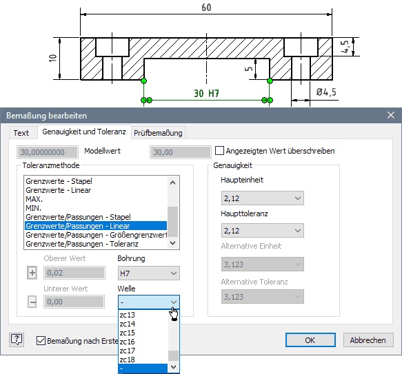 Damit die Führung nicht klemmt oder zuviel Spiel besitzt, muss man eine geeignete Passung mit ISO-Toleranzen verwenden (Siehe [1] S.3.9 ff). Im Beispiel verwenden wir für das Innenmaß 30 mm eine ISO-Toleranz H7 (Doppelklick auf Maßzahl)