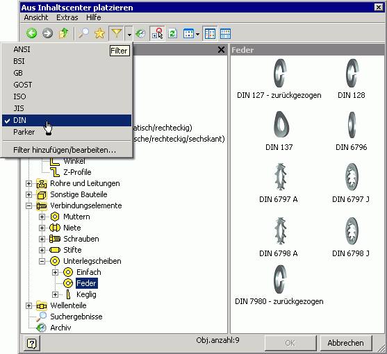 - Hat man nicht nur die DIN-Normteile installiert, so sollte man wegen der Übersichtlichkeit mit dem Filter nur DIN für die Anzeige auswählen.