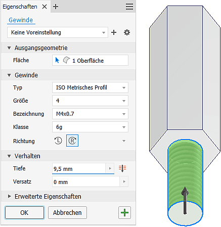 - Das Gewinde darf sich nicht über den gesamten Zapfen erstrecken. Deshalb muss man die Zylinder-Fläche durch Anklicken der Kreisfläche als Anfangsseite wählen. Wir verwenden eine Gewindelänge=9,5 mm.