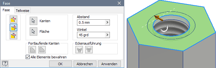 Den Gewindeanfang versehen wir mit einer Fase 0.5x45°. Es werden verschiedene Möglichkeiten der Fasen-Definition bereitgestellt: