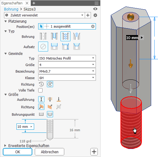 - Parametrisieren der Bohrung entsprechend obiger Anforderungen: