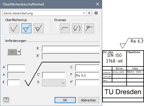 - Die Dialogmaske entspricht nicht ganz den Vorgaben der Norm für die zu beschreibende mittlere Oberflächenrauheit und muss deshalb sinngemäß angewandt werden: