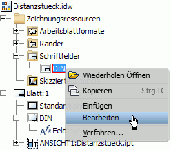 - Jedes neue Blatt erhält standardmäßig das aktuelle DIN-Schriftfeld aus den Zeichnungsressourcen.