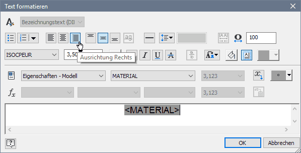 - Der Text für die Material-Eigenschaft ist im Rahmen des Textfeldes horizontal und vertikal zentriert.