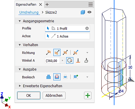 - Extrusion eines Kreisringes (Profilskizze) in Richtung der Zapfenachse.