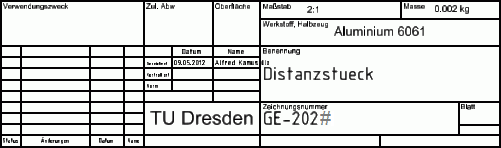 Das Schriftfeld wurde nach dem Platzieren der Erstansicht automatisch mit Informationen aus dem Bauteil belegt (Variablen aus iProperties - fehlenden Masse-Wert erneut berechnen durch "Aktualisieren" in physikalischen Eigenschaften):