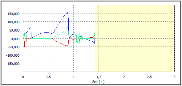 Startet man die Simulation über einen Zeitbereich von 3 s mit 300 Schritten, so wird es für diese beispielhafte Ausgangslage infolge von Prellvorgängen sehr schnell zu einem Verklemmen des Mechanismus kommen: