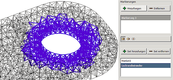 Ist man mit der Auswahl zufrieden, fügt man sie als Markierung hinzu, aus welcher man durch "Set hinzufügen" die Menge der "Lochrandtetraeder" definiert: