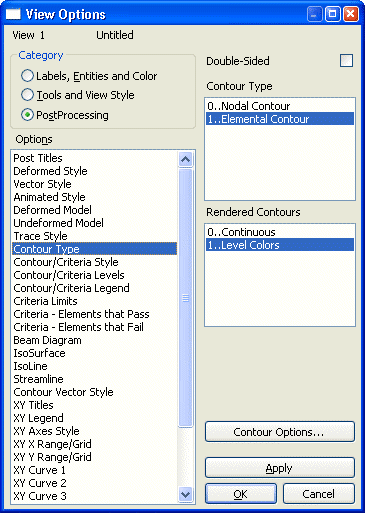 Aus diesen Knotenwerten wird im FEMAP nur dann ein sinnvoller Farbverlauf erzeugt, wenn man in den Contour-Options (Unterdialog von View-Select<F5>) Contour Type=Elemental aktiviert hat: