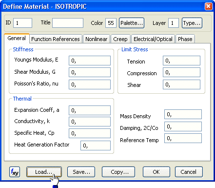 - Man könnte die Parameter der Material-Eigenschaften direkt eingeben. Günstiger ist sicher die Benutzung einer Materialbibliothek (Load). Wir wählen das Material AISI 4130 Steel und quittieren mit OK.