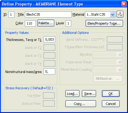 Wir werden unsere Platte als 2D-Modell aufbauen, d.h. wir verwenden eine Lage von Flächen-Elementen. Für diese Flächen-Elemente müssen wir zuvor die Element-Eigenschaft (Property) definieren. Das entspricht z.B. der Type-Definition in Programmiersprachen.