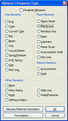 - Mittels (Model > Property) gelangen wir in den zugehörigen Dialog, dabei wird auf Grund der vorhandenen Flächengeometrie erkannt, dass man wahrscheinlich Flächenelemente benötigt. Wir wählen aus der Menge der von FEMAP unterstützten Elem/Property Type die Membrane (ohne weitere Spezifizierung):