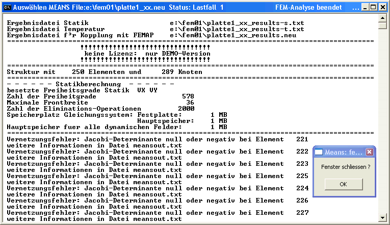 Achtung: Im MEANS-Fenster wird ein Kurz-Protokoll generiert. Mit größter Wahrscheinlichkeit erscheinen in unserem Beispiel darin Fehlermeldungen in Bezug auf die Jacobi-Determinante: