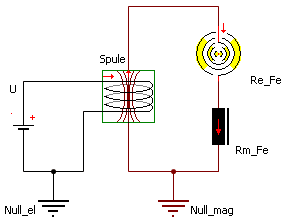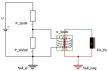 - Dieser ohmsche Widerstand R_Wirbel muss direkt parallel zu den widerstandslosen Windungen der Spule angeordnet werden. Dazu müsste man im SimulationX-Spulenelement Rel=0 setzen!
