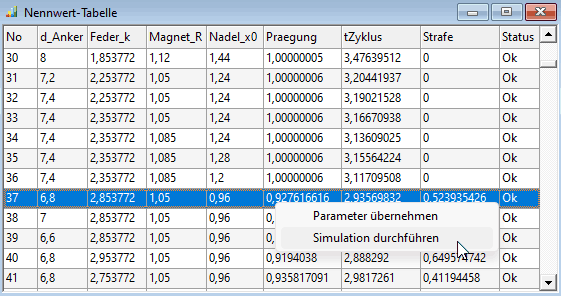 • Analog zu den Nennwert-Verläufen steht in der Nennwert-Tabelle das Kontext-Menü für jeden Optimierungsschritt zur Verfügung. Falls man sich dafür interessiert, was im Detail bei nicht vollständigem Prägen passiert, kann man einen entsprechenden Optimierungsschritt auswählen und die Simulation mit diesen Parametern starten.