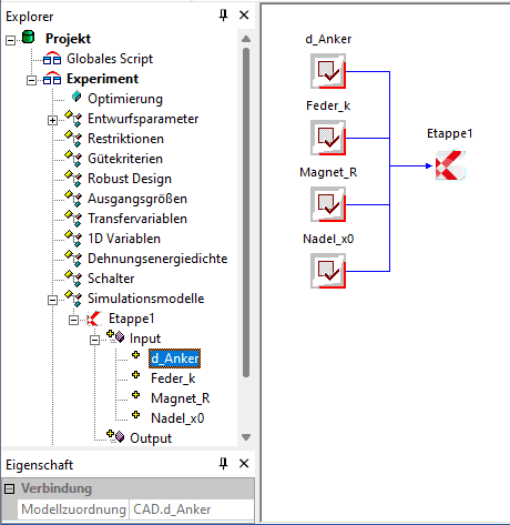 Nach Abschluss der Zuordnung erscheinen die Verbindungen im Workflow und können als Eigenschaft der Input-Größen angezeigt werden. Hier sollte man überprüfen, ob alle Zuordnungen korrekt erfolgt sind: