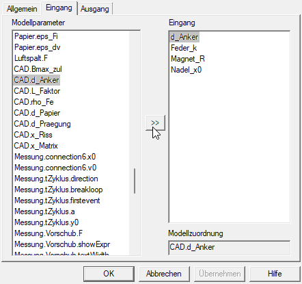 Eine Verbindung wird realisiert, indem man in den Listen den zu verbindenden Modellparameter und die zugehörige Eingangsgröße markiert. Erst nach Betätigen des Verbindungsbuttons (wie im Bild gezeigt), wird für die gewählte Eingangsgröße die Modellzuordnung hergestellt (erkennbar am Eintrag im Feld "Modellzuordnung" bei gewählter Eingangsgröße!).